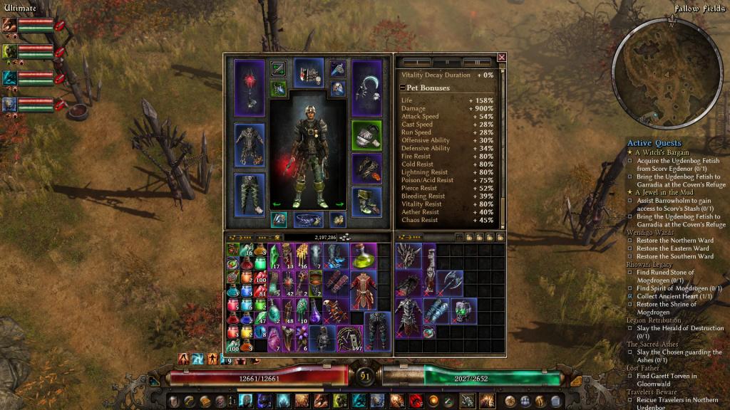Rest comes with gear, you’ll see in the attached stats below that their Bleed/Pierce/Chaos/Aether is not yet capped… but at least aim for 40%+. I would likely max Aether and Bleed next if possible. I’m also running an Enchanted Flint, which I will probably drop for the Chaos Ward aura soon (which would bring both my pets and my own chaos resist up another 20%.)