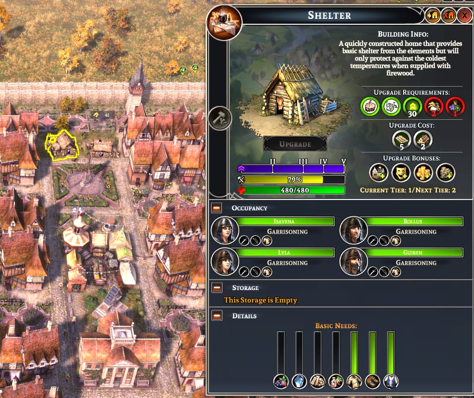 A shelter containing 4 tower guards will never upgrade because the guards never leave the tower to stock the shelter. The shelter in my screenshot has been like that for years; the one next to it has 3 guards and a forager who doesn’t ever seem to visit that house to restock it. The mansions around it were built at the same time. I think the solution would be either to never put all guards in the same house, or allow the guards to visit their houses when there is no raid in progress.