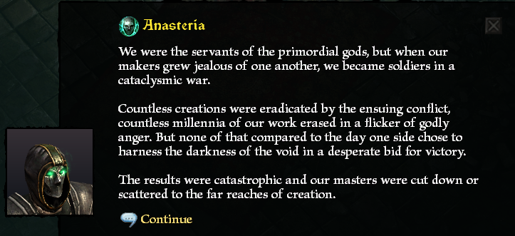 > Anasteria - we will find perhaps the true reason of why the Etherials want to enslave Cairn (i would assume at one point they are not the main enemy but the Forgotten God).