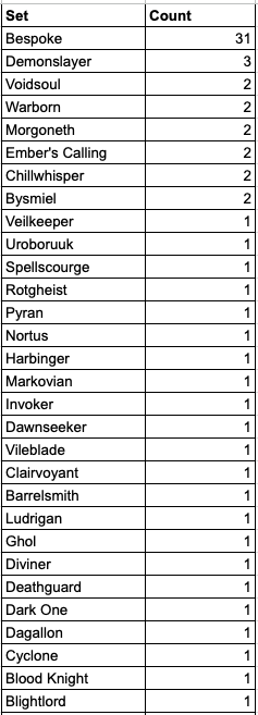 The original Demonslayer, a leech tank ready to take on the world of demons and beasts. Can facetank most boss combos in SR30-31 as well as Ravager and Callagadra. It went through an entire saga of buffs and nerfs and ended up landing on a solid spot. Rumoured to be a part of a gang of triplets that include a Witch Hunter and a Dervish. Can even be played as a Trickster, with both vitality and bleed focus, and to top that off it has budget MI alternatives. All that puts this set in a unique position as a chase goal of a caster Nightblade starter.
