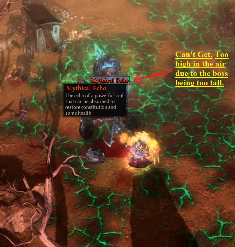 Talking about the pink sphere that contains a rune word that appears after you kill a boss or sometimes a rare monster. There are many times that it just hangs there in the air and I can’t get to it. I notice this happens a lot when I fight really tall monsters.