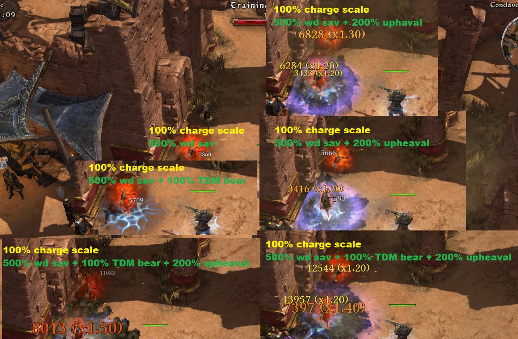 modified stats: 100% charge scaling(all ranks), 500%wd sav, 100% Might of the Bear, 200%wd upheaval, no native sav/upheaval flats, no dots