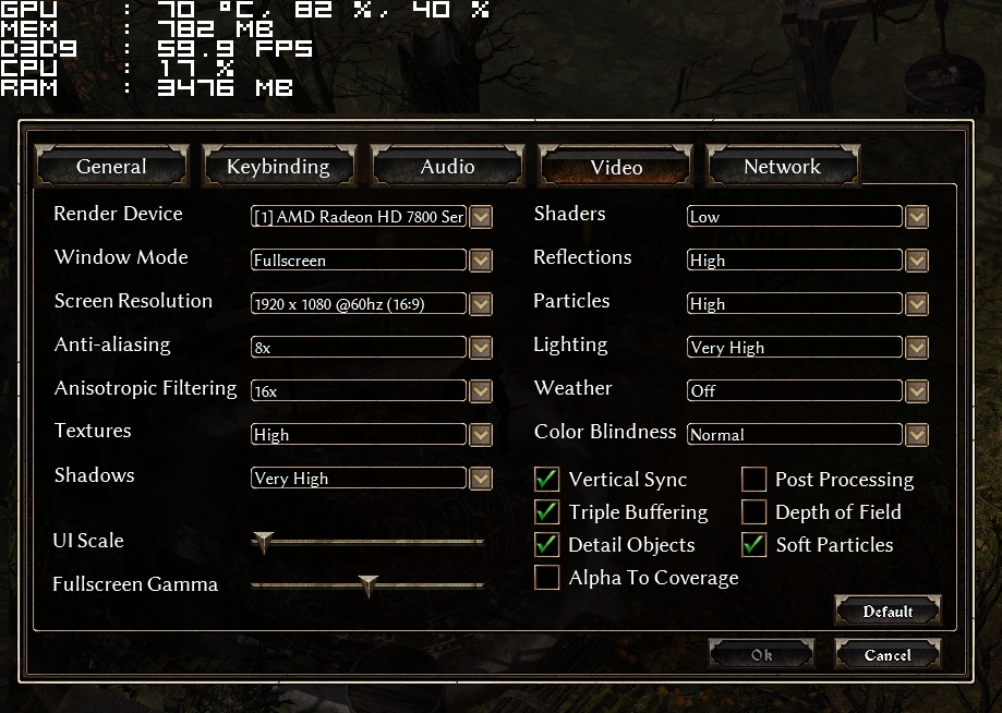 So this is my first experience with Grim Dawn. Coming from Titan Quest, which looks more than fine to my eyes and never causes problems with my GPU fan, I am puzzled to see that I cannot achieve the same (apparent) graphics quality in GD without forcing the graphics card…
