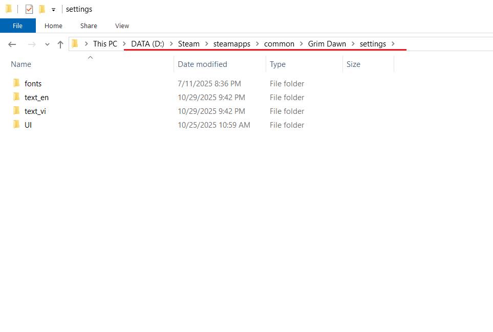 Tải về rồi giải nén nguyên folder “settings” vào folder cài Grim Dawn. Nếu đã có folder này rồi thì bỏ các folder con text_vi, text_en, fonts, UI vào. Xem hướng dẫn ở hình dưới.