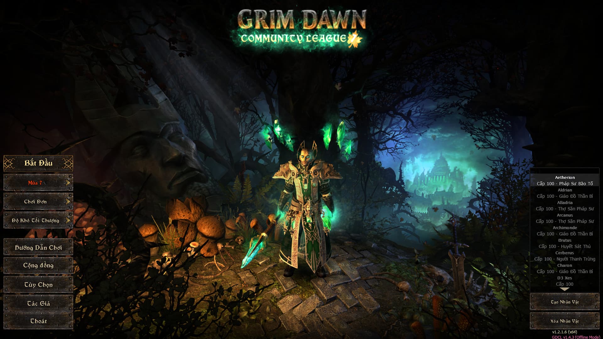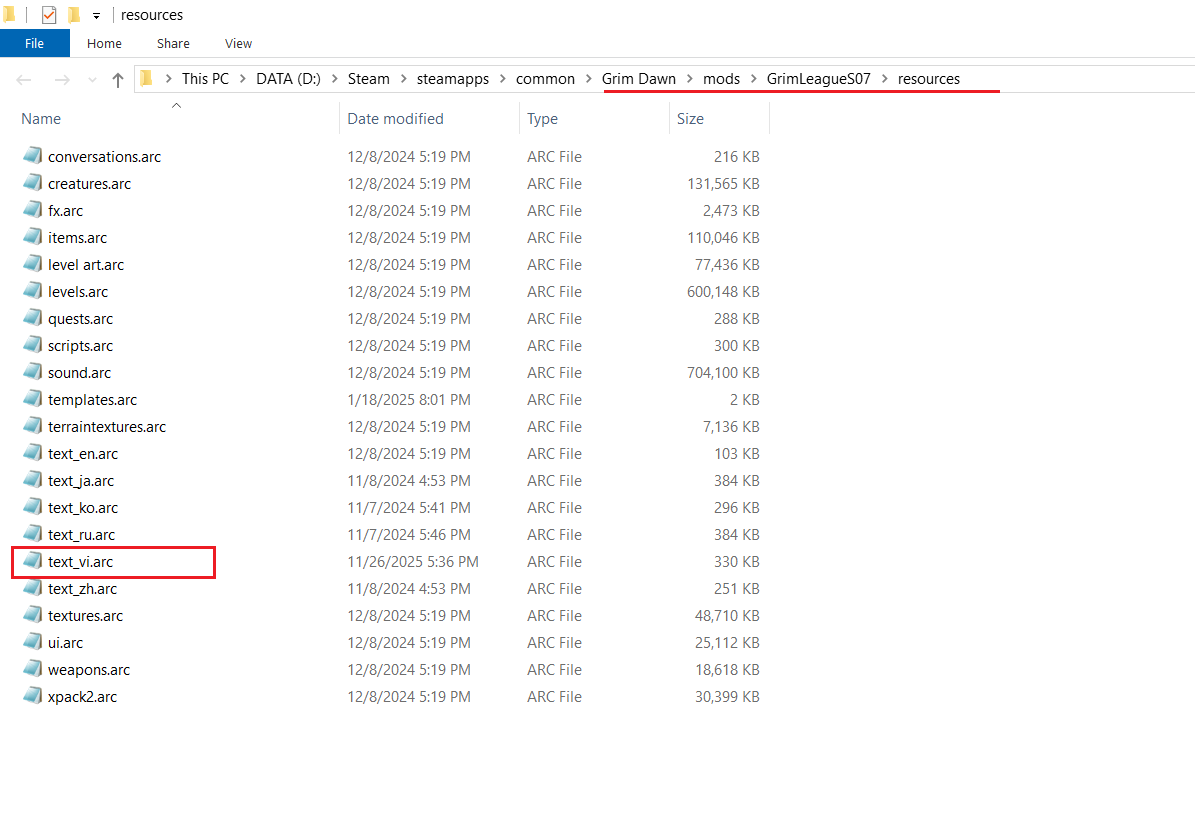 Bỏ file text_vi.arc vào folder “resources” trong folder “GrimLeagueS07”, chung chỗ với các ngôn ngữ khác như text_ja, text_zh… Vào game và chọn Tiếng Việt trong mục Option của game. - Tải Grim League và Launcher của nó về, giải nén folder “GrimLeagueS07” vào folder “mods” trong chỗ cài Grim Dawn. Nếu không có folder “mods” thì tạo. Còn Launcher thì giải nén 2 file trong đó vào folder cài Grim Dawn.