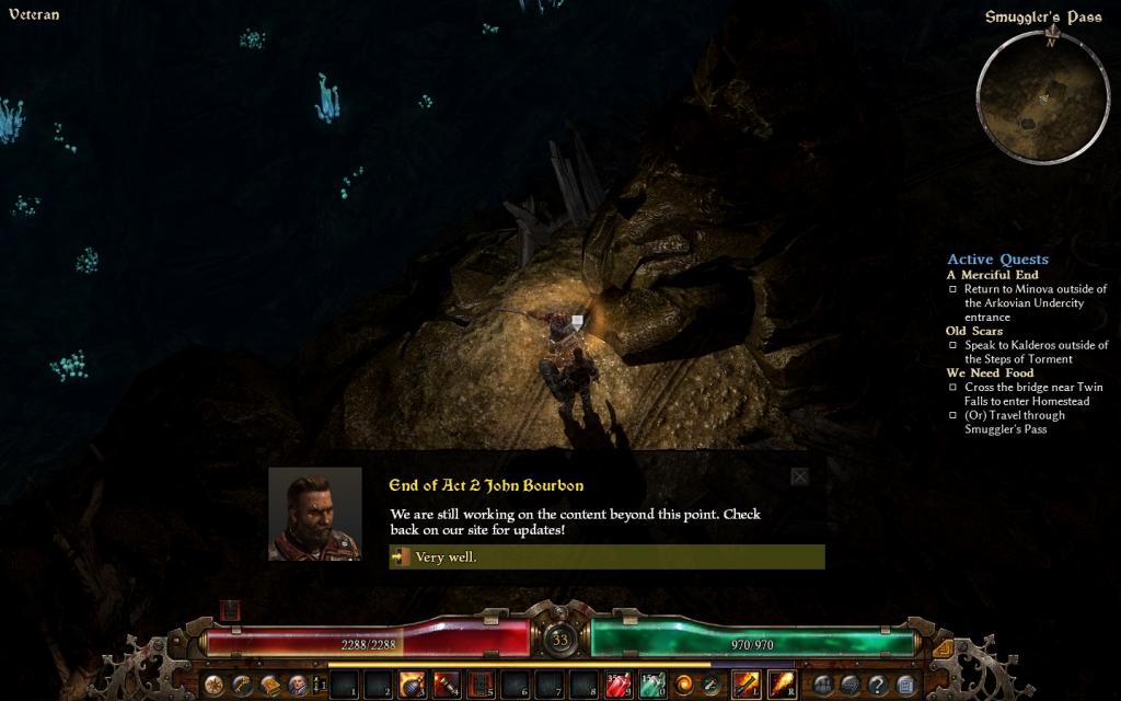 Act II finished at the end of Smuggler’s Pass and Act III at Darkvale Gate.
