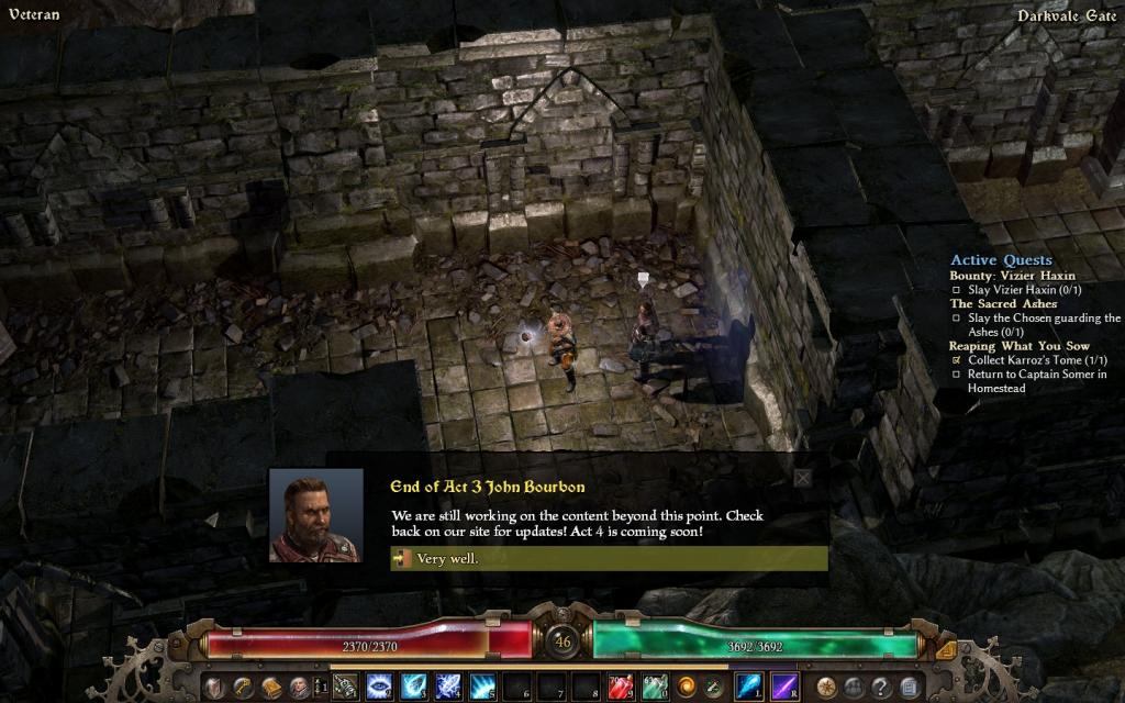 The worst stretch (IMO) is at the start of Act 4, the route between Darkvale Gate and Fort Ikon: long, mostly linear, repetitive zones with little of interest and barely any interaction (quests).